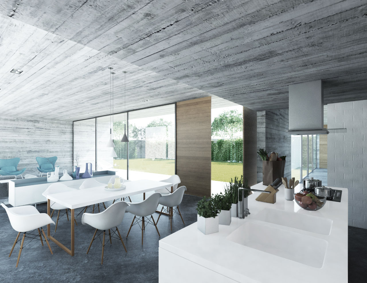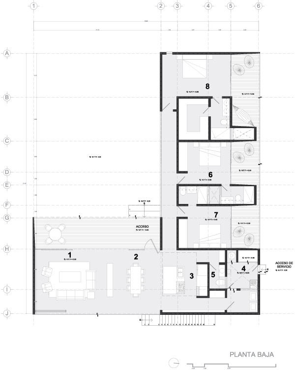 La casa funciona con un partido arquitectónico muy sencillo en forma de “L”, mismo que reúne las vistas de los espacios principales al jardín privativo, mientras que las habitaciones secundarias, protegidas por el asoleamiento, logran una vista más privada a los huertos posteriores de la propiedad.