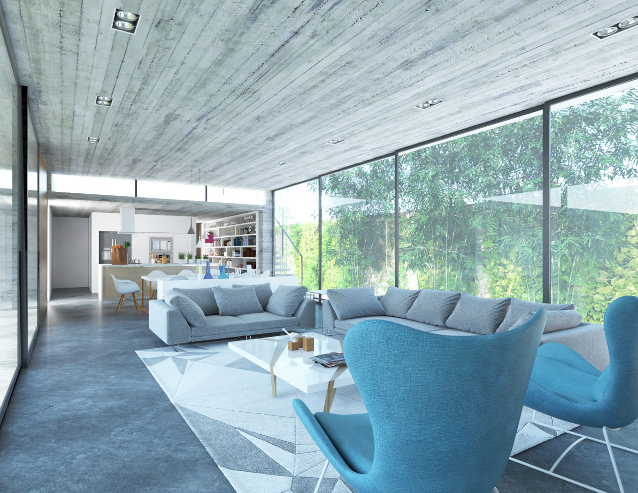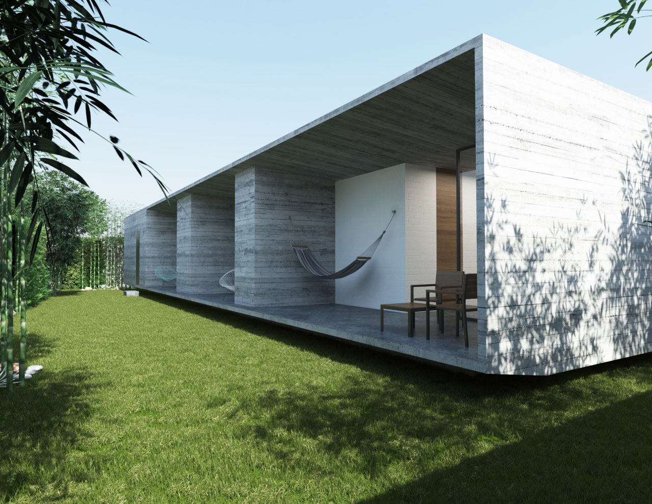 El proyecto busca refrescar la casa con materiales como el concreto en muros, plafones y pisos, y bajar las altas temperaturas en cierta época del año. Entradas de luz cenitales y ventilaciones cruzadas con desfogues por la azotea para refrescar la propia ventilación y el calor que pueda transmitirse por el subsuelo, a su vez, la casa de desplanta sobre un basamento elevado 80cm para evitar roedores, inundaciones y altas temperaturas.