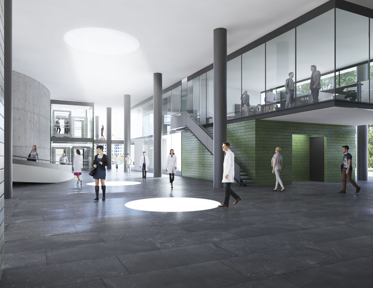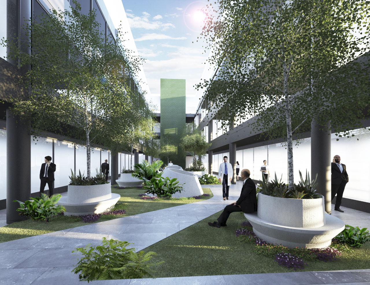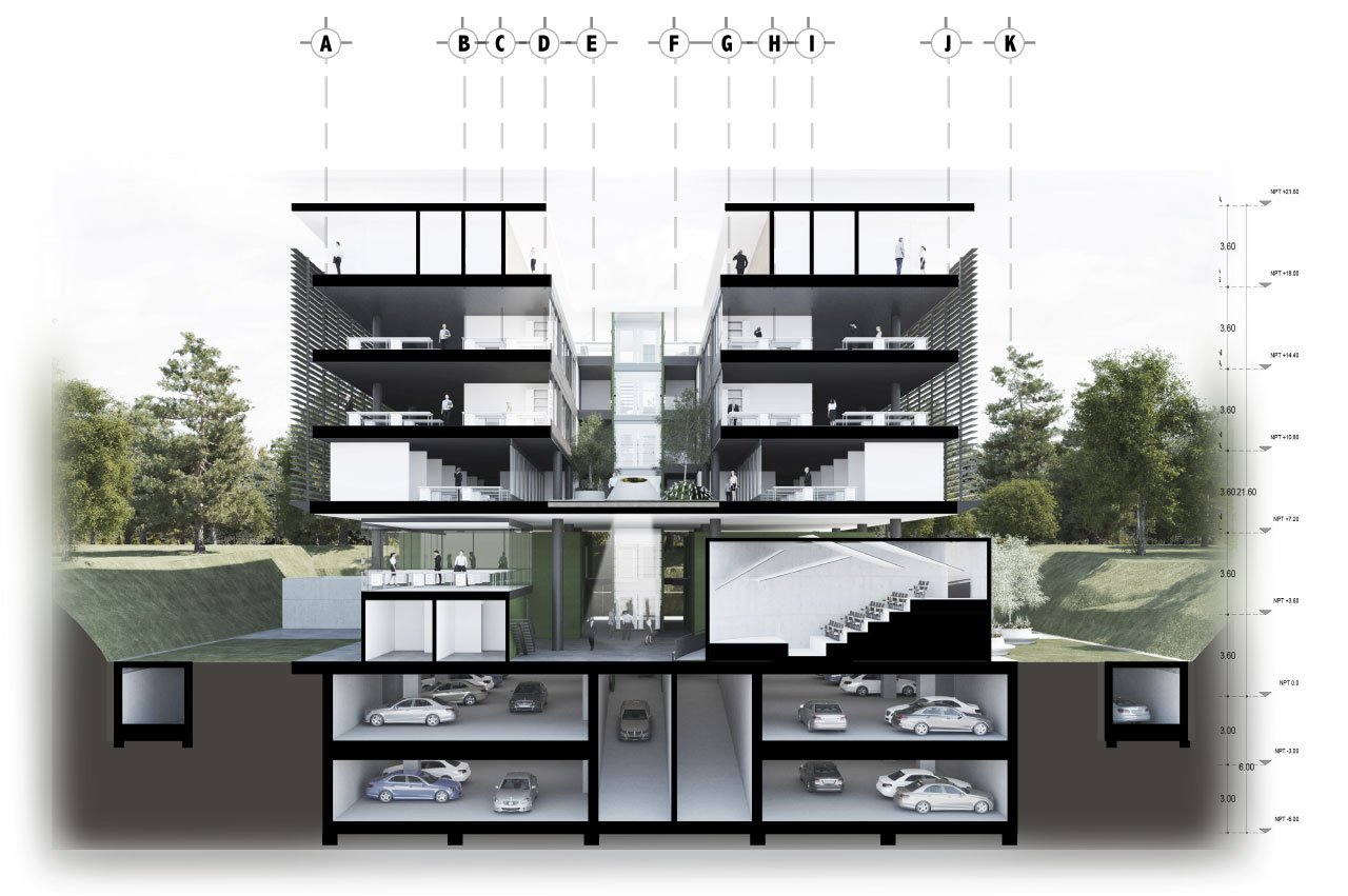 La fachada del edificio, compuesta por dos pieles, con la finalidad de controlar la ventilación cruzada en todos los niveles, así como el control de la insidencia solar en los diferentes espacios. En el interior, un jardín elevado que permita la relación directa con áreas verdes. La planta baja será libre y con doble altura, permitiendo una flexibilidd visual con el contorno en todo momento.