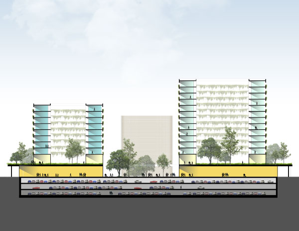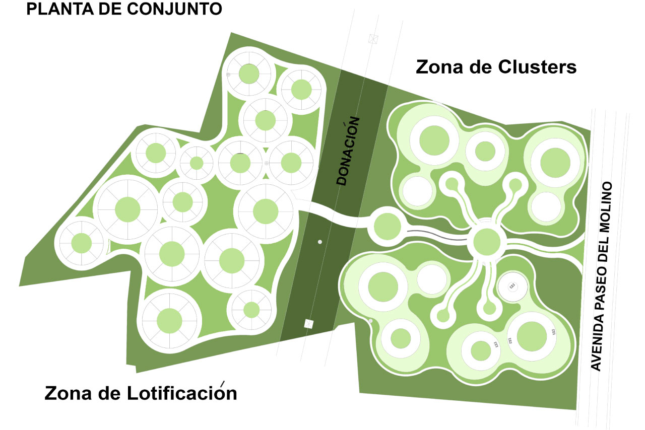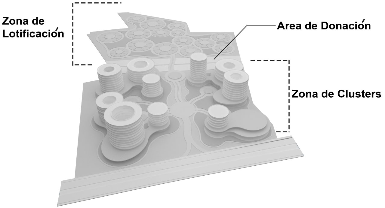 Este plan presenta la posibilidad de crear 'Clusters' con diferentes usos de acuerdo a un análisis previo de toda la región colindante a la loma en Aguascalientes, que sirviera para dar servicios y atraer inversión económica. La primera parte del terreno, cerca de 55 Ha, está destinado a estos clusters con entre 8 y 15 niveles, que funcionan como edificios mixtos con áreas comerciales, amenidades, jardines, viviendas, servicios y espacios de trabajo.