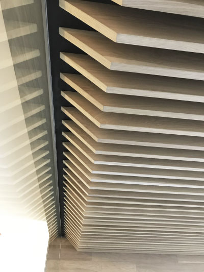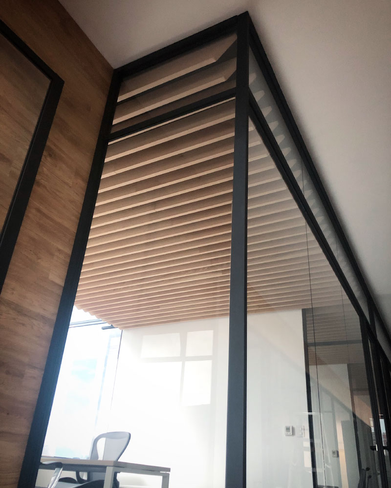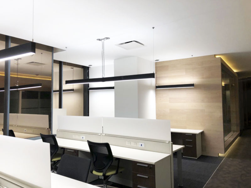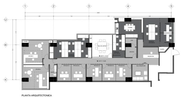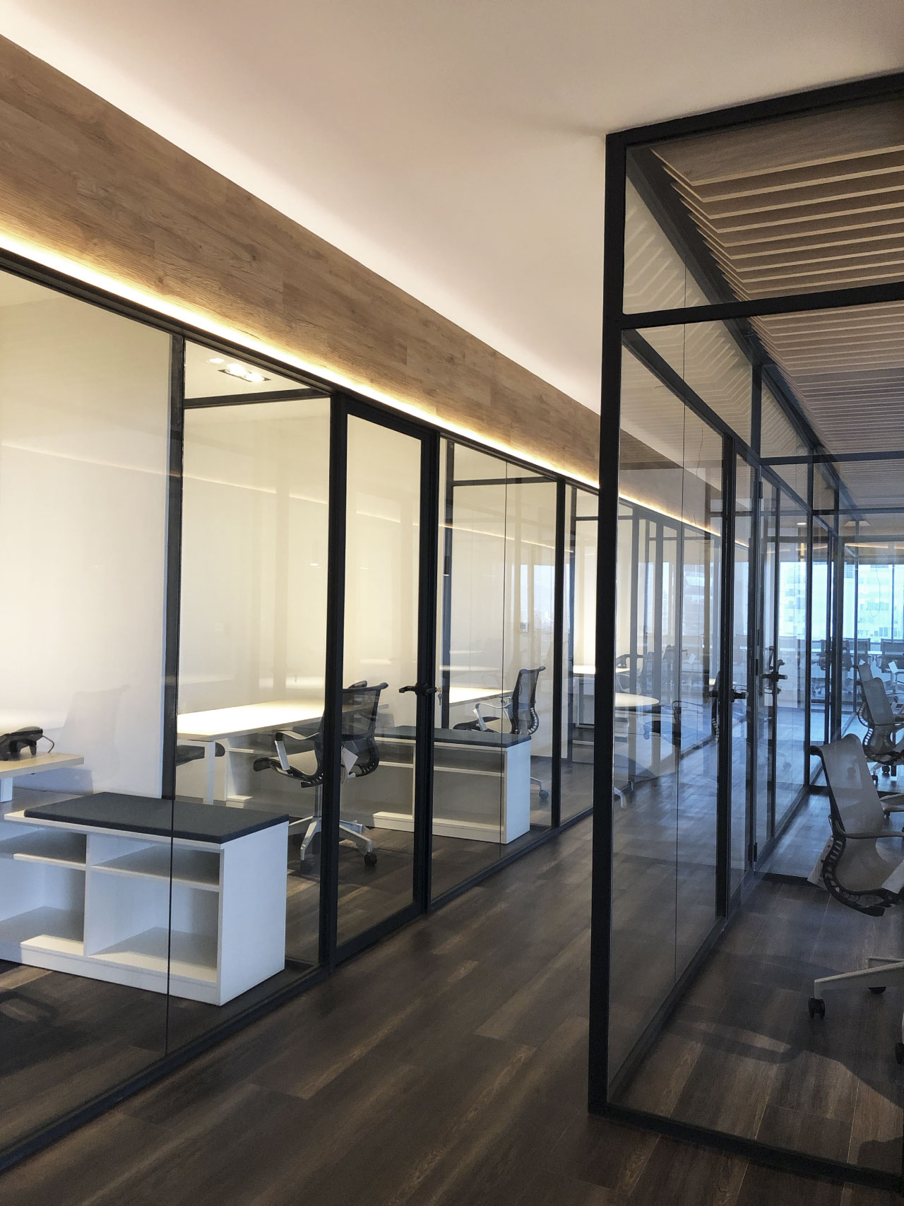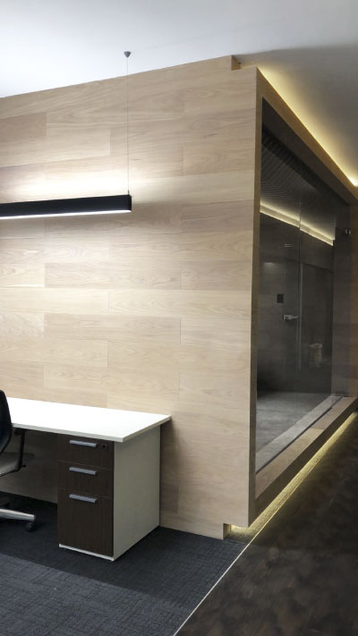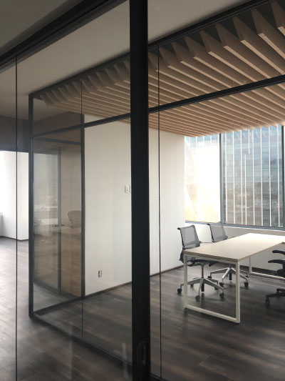 Marimbas en plafones, ayudando a la parte acústica, celosías para dividir espacios, y salas de juntas tipo ¨Think Box¨, pisos de madera y mármoles en gran formato, para darle un toque de elegancia. La iluminación indirecta en recorridos, hace de esta oficina un espacio agradable para trabajar.